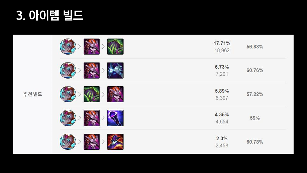 숲풀에 강화된 묘목은 추가타가 발동되고 터지는 범위가 넓어지기에 꽤 여러 챔피언을 괴롭히기에 적당합니다. 자연스럽게 리안드리를 들어줌으로 지속딜을 강력하게 하고 2번째 템으로 악마의 포옹까지 나온다면 탱커들도 리안드리, 악마의 포옹 효과 그리고 체력% 묘목 딜에 살살 녹는 것을 보실 수 있습니다. 상대 탱커까지 괴롭히는 포킹딜이기 때문에 칼바람 극딜 마오카이는 1티어 자리를 꾸준히 유지하고 있습니다. 3번째 템은 상황에 맞게 유동적으로 올려주되 가급적 스킬 쿨감이 붙거나 치감이 붙은 아이템을 선택해주는 것이 지속딜에 더 효과적입니다.