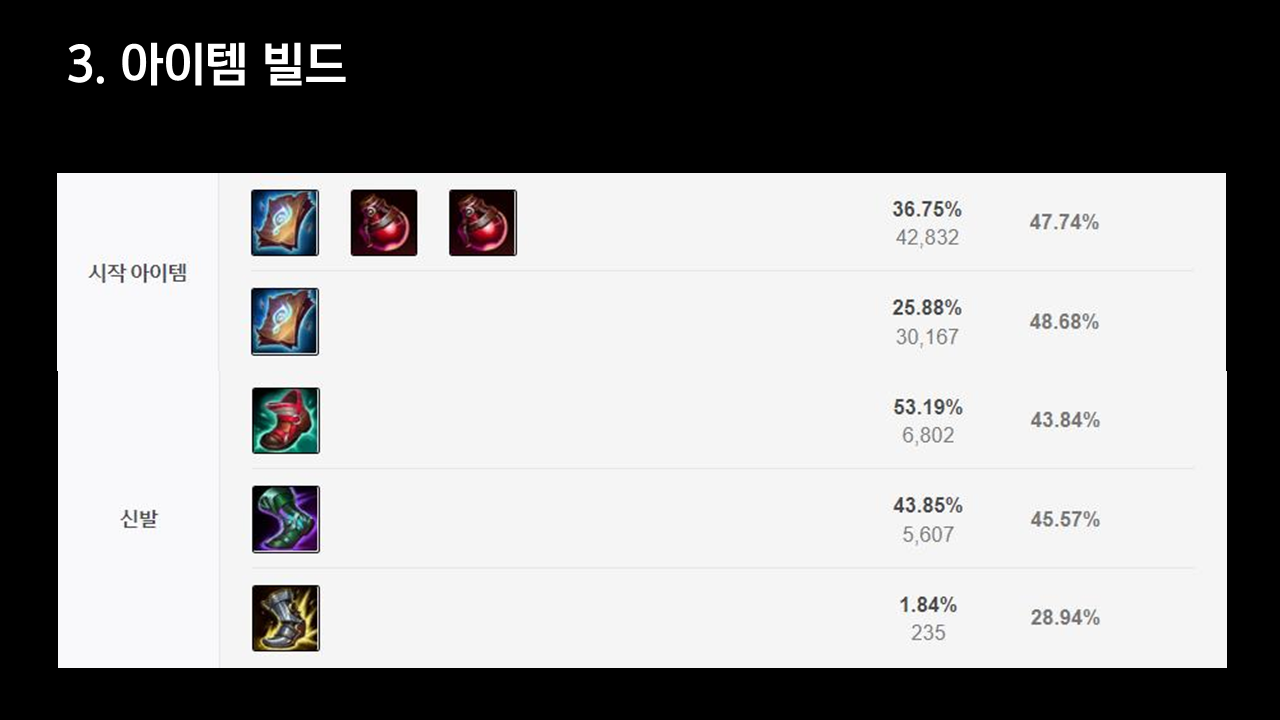 유성보다 콩콩이의 픽률과 승률이 압도적으로 높은 것을 확인할 수 있습니다. 콩콩이 룬을 드는 경우 대부분 서폿 플레이를 정석으로 하는 경우가 더 많이게 이런 지표가 나타나는 것으로 보입니다. 아군과 적군 모두에게 확정적으로 콩콩이 효과를 줄 수 있어 유미에겐 찰떡같은 룬이라고 할 수 있습니다.